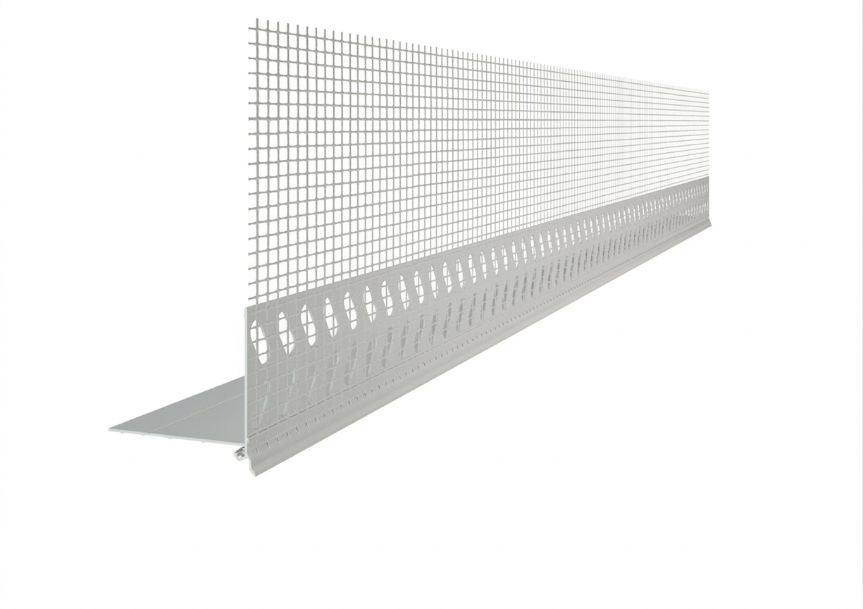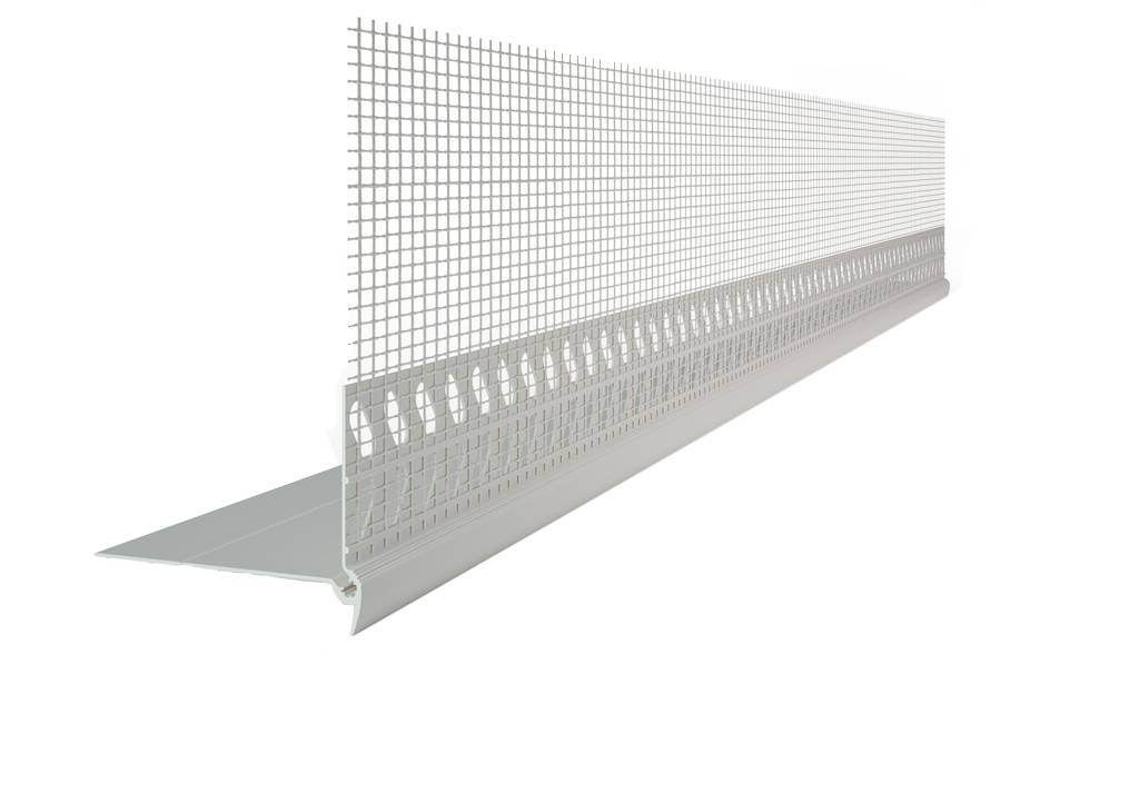 Dieses hochwertige PVC-Sockeleinsteckprofil mit Gewebe dient der professionellen Ausbildung von Tropfkanten an den Übergängen zwischen Fassaden- und Sockeldämmung. Es ist zudem ideal geeignet für Übergänge bei unterschiedlichen Dämmstoffstärken innerhalb der Fassadenfläche.